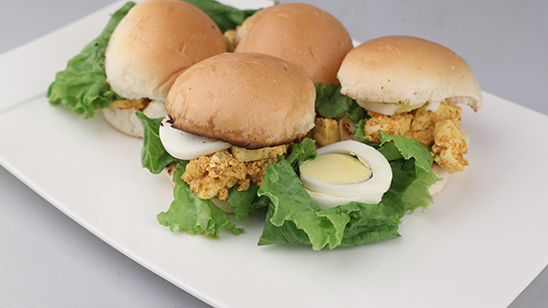 Heat oil. Add Achaari masala sauté and then set aside to cool. Add this mixture to hung curd and mix well. Marinate the cottage cheese cubes with this mixture. Keep aside for five minutes. Then cook the cheese cubes.Add chopped garlic to butter. Spread this on the buns. Toast the buns. Place the lettuce leaves on the buns and add cottage cheese on top. Garnish with boiled eggs & serve.