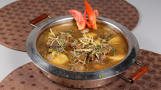 Heat oil, add onion, fry till light golden, remove. In the same oil, add ginger garlic paste with mutton, fry well for 10 mins, add black pepper, coriander, yogurt, salt and green chilies with ½ cup water, cover and cook till mutton half done, add to it coarsely grounded brown onion with small cubes of potatoes, now add 1 ½ cup water, cover and cook till potatoes and onion tender, leave it on dum till oil comes on top, remove on a serving dish, garnish with chopped coriander, green chilies, ginger julienne and serve.