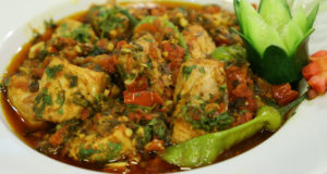 Heat ¼ cup oil, fry green chilies for 2 mins and remove, add Tikka boti, fry for 3 mins, remove and keep aside. In the same oil add onion, fry till light, add dry spices with blended tomatoes, cook for 5 mins till oil separates, add cashew paste with water, salt, add fried Tikka boti , simmer for 10 mins till gravy thick, add grated ginger with milk, cook till gravy thick, lastly add fried green chilies and cream, remove and serve.