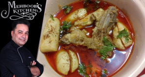 Wash ½ kg colocasia, grease your hands and add turmeric on it. Take a pan, add in ½ kg mutton, 2 chopped onion, 1 tsp turmeric, 1 tbsp red chili powder, 1 tbsp ginger garlic paste, 1 cup oil and 2 cup hot water. When the water of meat dries, add in colocasia, green chilies and cook it. Add in 2 – 2 ½ cup hot water. When the colocasia is cooked, add in lemon juice, 1 tsp all spice powder, chopped green chilies and ½ bunch chopped green coriander. Serve it with hot nan.