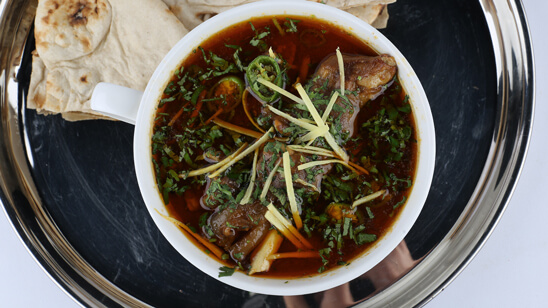Firstly wash the mutton trotters and add the beef bone marrow and stocks ingredients in it. Now cook it with water till the trotters are tender. Then sieve the stock and separate the trotters from it and with it set aside the bone marrow pulp. Now heat clarified butter and roast ginger garlic paste, salt, turmeric and yogurt. After that add all spices powder, nutmeg mace powder and trotters stock to boil at high flame and cook 30mins at medium flame. lastly dish It out and garnish it with green coriander, green chili and ginger chopped to serve.