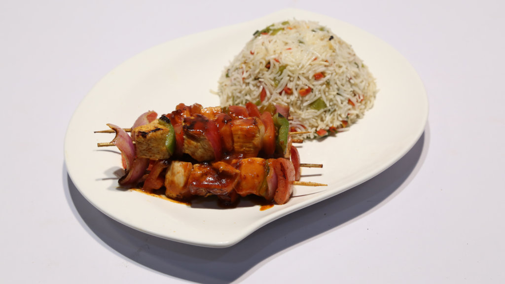 This BBQ Chicken Shashlik recipe is perfectly grilled with tangy sauce and served with fried rice! It’s a perfect weekend dinner kind of recipe.