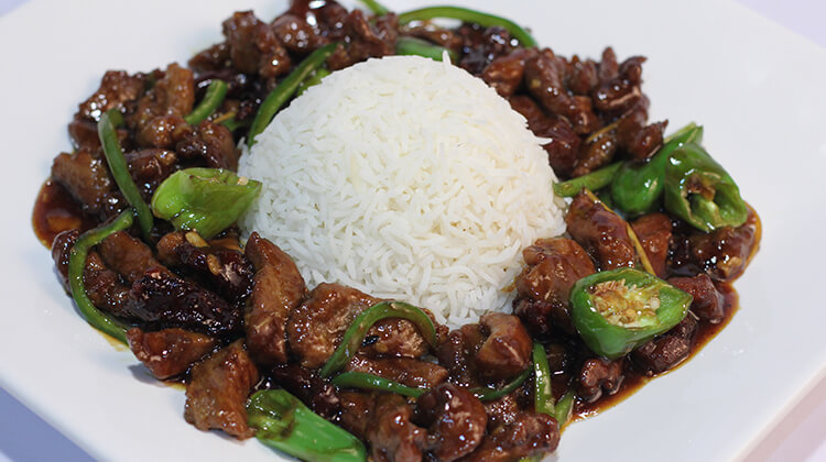 Now in a pan heat 4 tbsp oil and stir fry it on low heat. When water evaporates, then in another frying pan add 1 tbsp oil and stir fry green chilies and add it in the meat and cook .then in oyster sauce add corn flour ,1 tbsp sugar ,2 cup of water and cook for 5 minutes and then pour on beef and garnish with capsicums ,ginger and serve with rice .