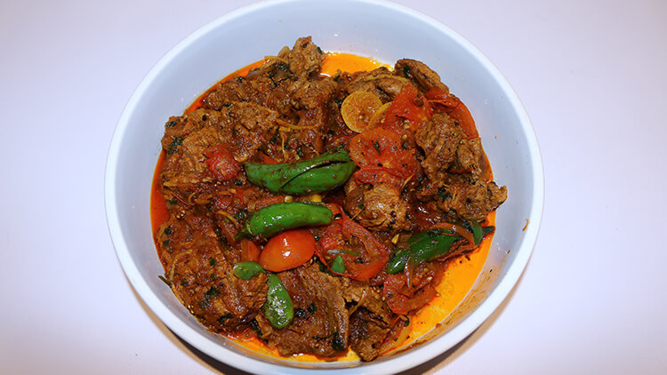 Boiled beef strips. Turn off flame when its done. Heat oil fries the onion till brown in color. Add crushed black pepper, salt, red chili, green chilies and beef cook till done. Add lemon juice, green coriander and chopped ginger, turn off flame. Add tomatoes sliced and serve.