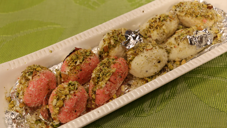 - Lastly add pistachio and coconut powder and serve with silver paper .