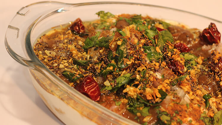In a bowl add gram flour, chili powder, cumin seeds, baking soda, yellow lentil, salt, carom seeds, 1-1/2 cup of water and mix well. Now heat oil in a pan and deep fry baray for 6 to 8 minutes. Remove and to a bowl of water and let it soak for 5 minutes. Then remove, squeeze and set aside. Now place baray in a dish and spoon yogurt on top. Then add tamarind pulp, chaat masala, onion, coriander and black salt and set aside. For baghaar heat ¼ cup of oil add whole red chilies, garlic and curry leaves and fry for ½ minute. Then add cumin seeds and pour over the baray and serve.