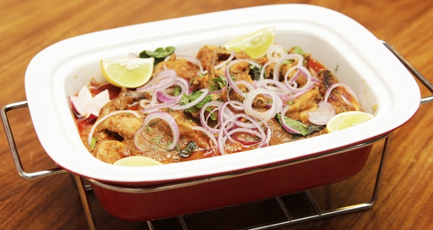 Marinate chicken with raw papaya 1 tbsp heaped, Ginger garlic 2 tbsp, Salt 1 ½ tbsp, Chili powder 1 ½ tbsp, Poppy seeds roasted and grinded 1 tbsp, Roasted gram grinded 2 tbsp, Roasted and crushed cumin 1 tsp, Yogurt 1 cup, Mixed all spice 1 tsp, Brown onion fried and crushed 2 tbsp heaped for 1 hour, heat oil in a pan add marinated chicken cover and cook until done, lastly give dum of coal, serve garnished with onion rings, coriander leaves and green chilies.