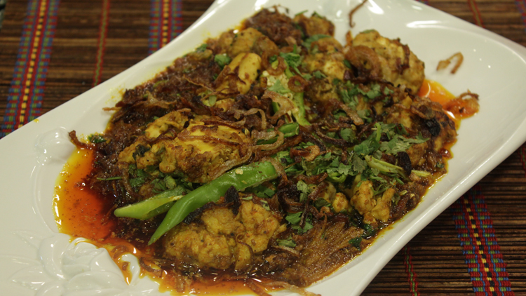 - In the end, garnish it with chopped ginger, ½ bunch chopped green coriander, chopped green chilies and fried onion. Serve hot.