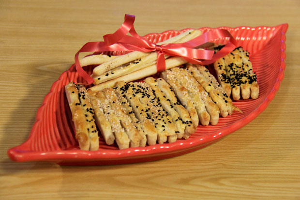 Place yeast and sugar in a cup. Pour lukewarm water over this and cover. Let it rise for five to seven minutes. Sift flour and salt together. Place in a large mixing bowl. Make a well in the centre of the flour and place yeast liquid into the well in the flour and mix. Rub in softened ghee and knead lightly for about ten minutes to form a smooth but fairly firm dough, using extra water if needed. Cover with a moist cloth and rest until doubled in size. Knock back the dough, allow it to rest further for ten minutes and then roll it into a rectangle about one fourth inch thick on a lightly floured work surface. Preheat oven to 230°C. Cut the rolled dough into one centimetre by eight centimetre strips. Take individual strips and roll into ten to twelve centimetre long sticks. Place them on a greased baking tray. If using egg, beat it with a fork lightly. Brush bread sticks with egg and sprinkle with sesame seeds or onion seeds or poppy seeds. Bake in the preheated oven for fifteen minutes and then reduce temperature to 190°C for another ten minutes. Remove, cool and store in air-tight container.
