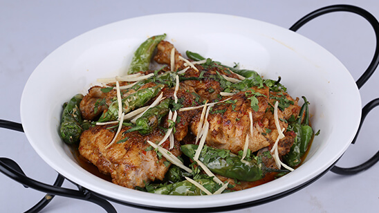 Put all spices on chicken and leave overnight. Now heat oil or clarified butter and shallow fry chicken it. Then heat clarified butter, fry green chilies and remove. In same clarified butter add ginger garlic paste, salt and yogurt and saute gravy well. Now add fry chicken and cook in slow flame until chicken get tender. Then saute it and add lemon juice, fry green chilies and chaat masala and let it simmer. Now take out in dish and garnish with green coriander and ginger.