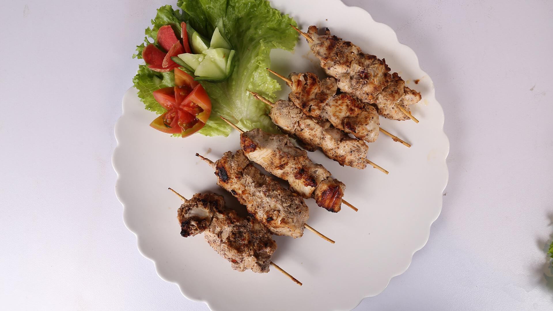 Cut chicken into boneless cubes, marinate with all the given spices for 2 hours, put on wooden skewers and pan fry, lastly give dum of coal, serve with onion and tomato rings.