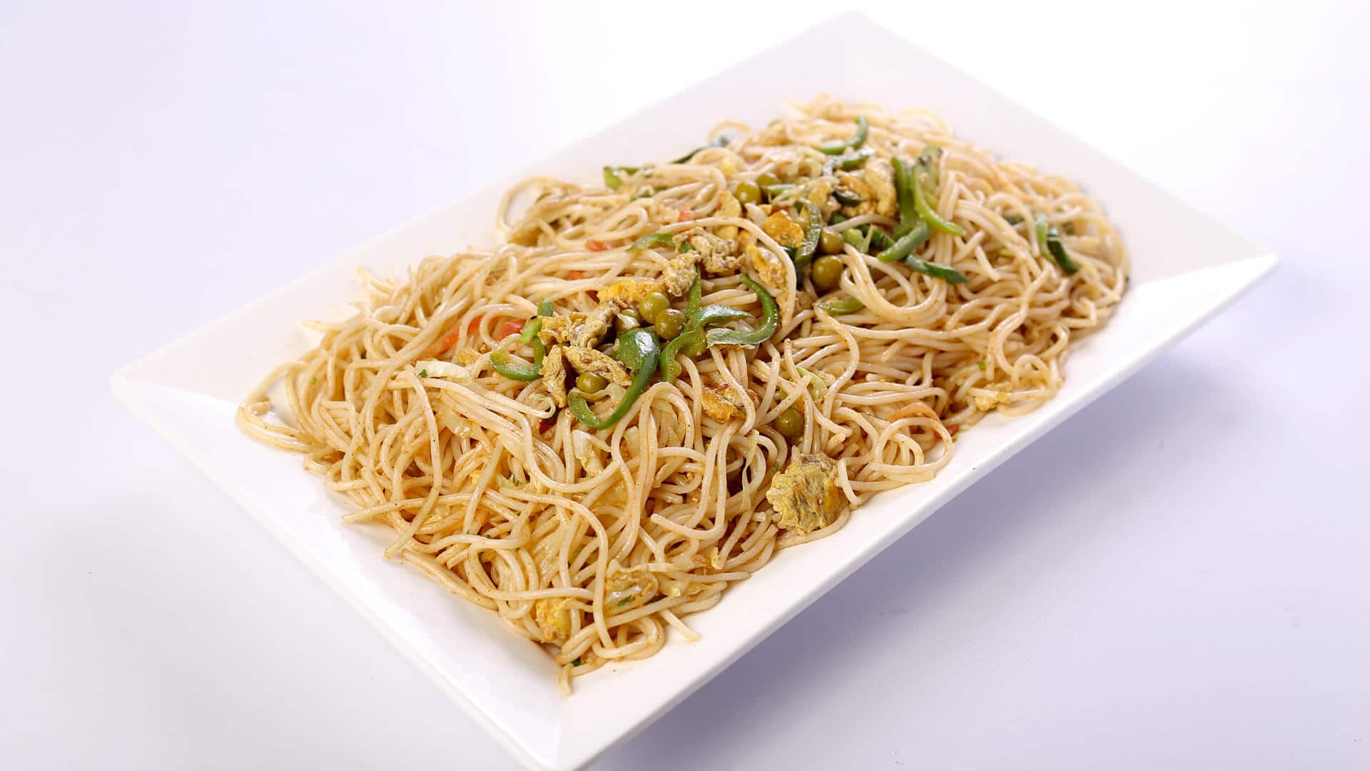 In a pan add ketchup, chili sauce, soy sauce and yogurt. Cook well and make a sauce. Then heat oil and sauté vegetables. Now add garlic, prepared sauce and spaghetti. Mix well. Then add salt and pepper. In the end serve with omelet and fries.