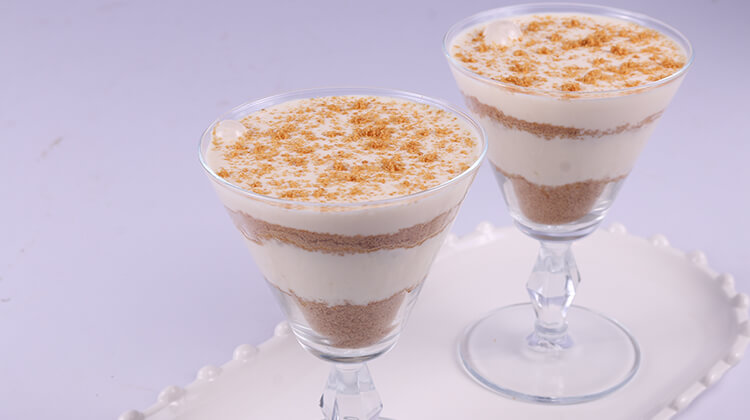 Now in a glass add some biscuits and cream mix following up with the biscuits. Top with the cream mix ending up with some biscuits on top.
