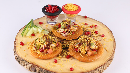 Arrange them on a platter spread both chutneys top with filling and sev garnish with pomograte seeds