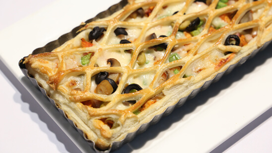 Roll the puff pastry and place it in mould , now make a layer of red sauce , then add chicken cut in cubes, cheese, black olives, mushrooms and herbs, now give it the shape of pie and bake on 170 degree oven , lastly dust with garlic powder and serve .