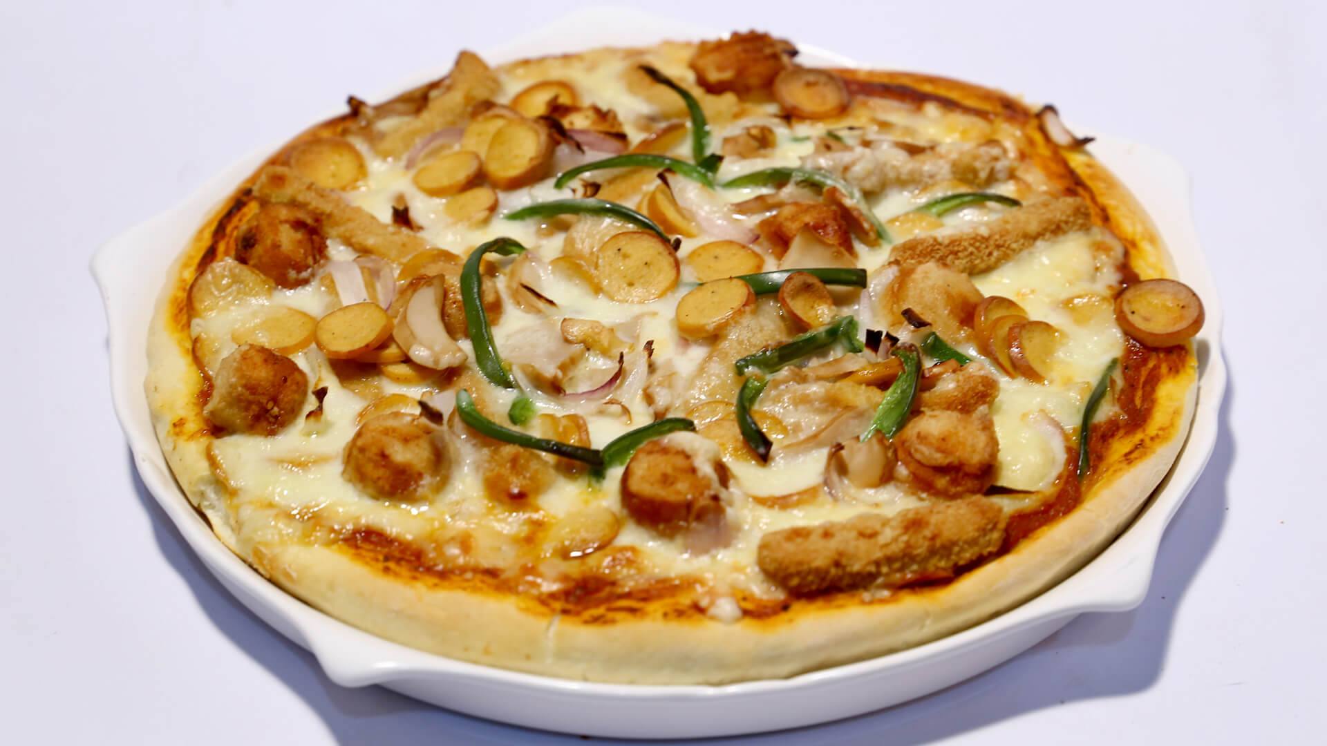 In a bowl mix the ingredients of the dough. Knead with lukewarm water. Cover and set aside to rise. Then heat oil in wok, deep fry the chicken fries and set aside. Now roll out the dough in a pizza pan. Spread pizza sauce on top. Then sprinkle cheese, add chicken and then vegetables. Bake on 200 c for about 25 minutes. Remove and serve hot.