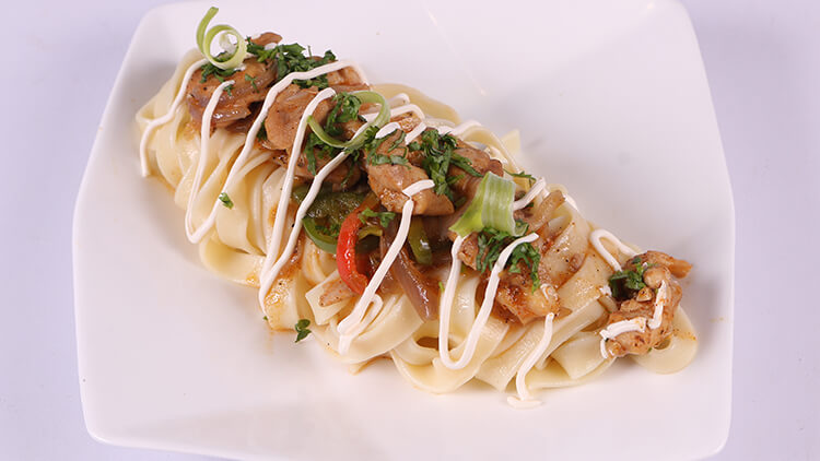 Saute chicken in oil and remove. Now add onion, mushrooms, capsicum, garlic and paprika in oil and cook. Then add tomatoes and tomato paste when water gets dries then add chicken with salt and black pepper. Serve with fettuccini with sour cream and green onions on top.