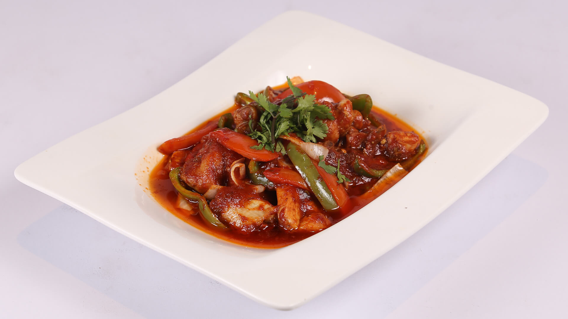 In a pan heat oil and sauté garlic and ginger .then add chicken and fry .then add some water and cook for 4 to 5 minutes .now add ketchup ,tomato paste and all ingredients mix and cook till than oil separate .finally add green coriander and serve .