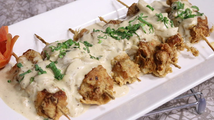 - Put on wooden skewers, make batter with flour, corn flour, egg, salt and pepper, and water as required.