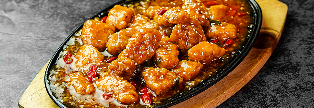 Heat a sizzler plate and grease with oil. Transfer prepared Chinese Chicken with Garlic Sauce and serve.