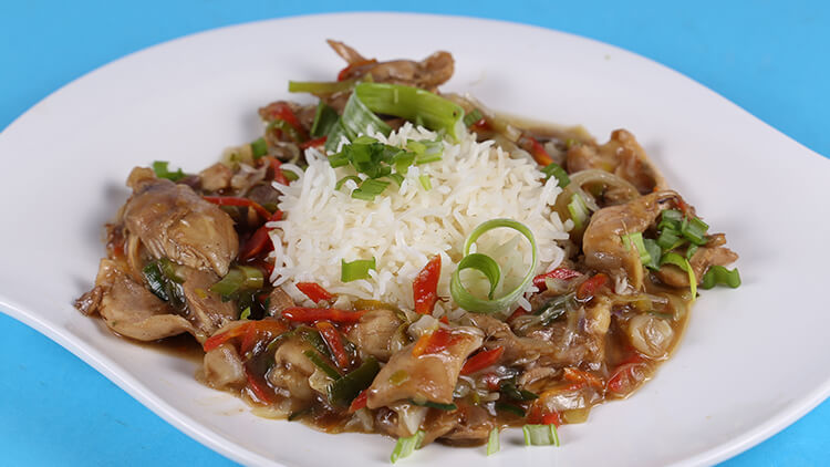 Mix all ingredients of chicken. Then mix sauce ingredients. Now fry chicken in oil then add garlic and all vegetables and stir fry them. In last add sauce ingredients and cook for 1 to 2 minutes and serve them with rice.