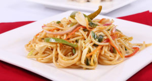 Heat oil in a wok add carrots, capsicum, chicken, soya sauce, vinegar, salt, hot sauce and red chili flakes. Cook well for a while. Then add flour, green onion and boiled noodles. Mix well and allow it to cool. Now in a samosa sheet, place the filling and seal with flour liquid. Then you can refrigerate or fry them until golden brown. Serve hot with chili garlic sauce.