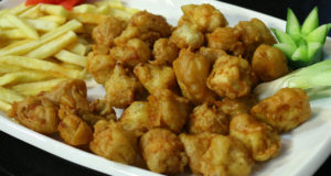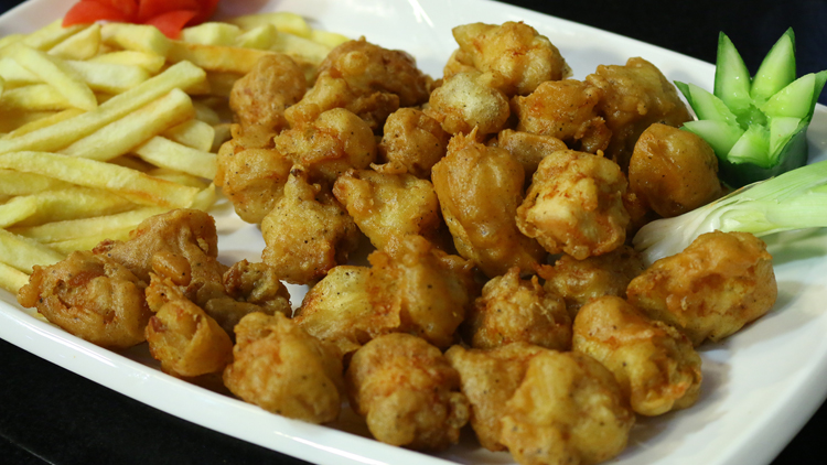 - Dip the chicken pieces in this batter and deep fry till light golden.