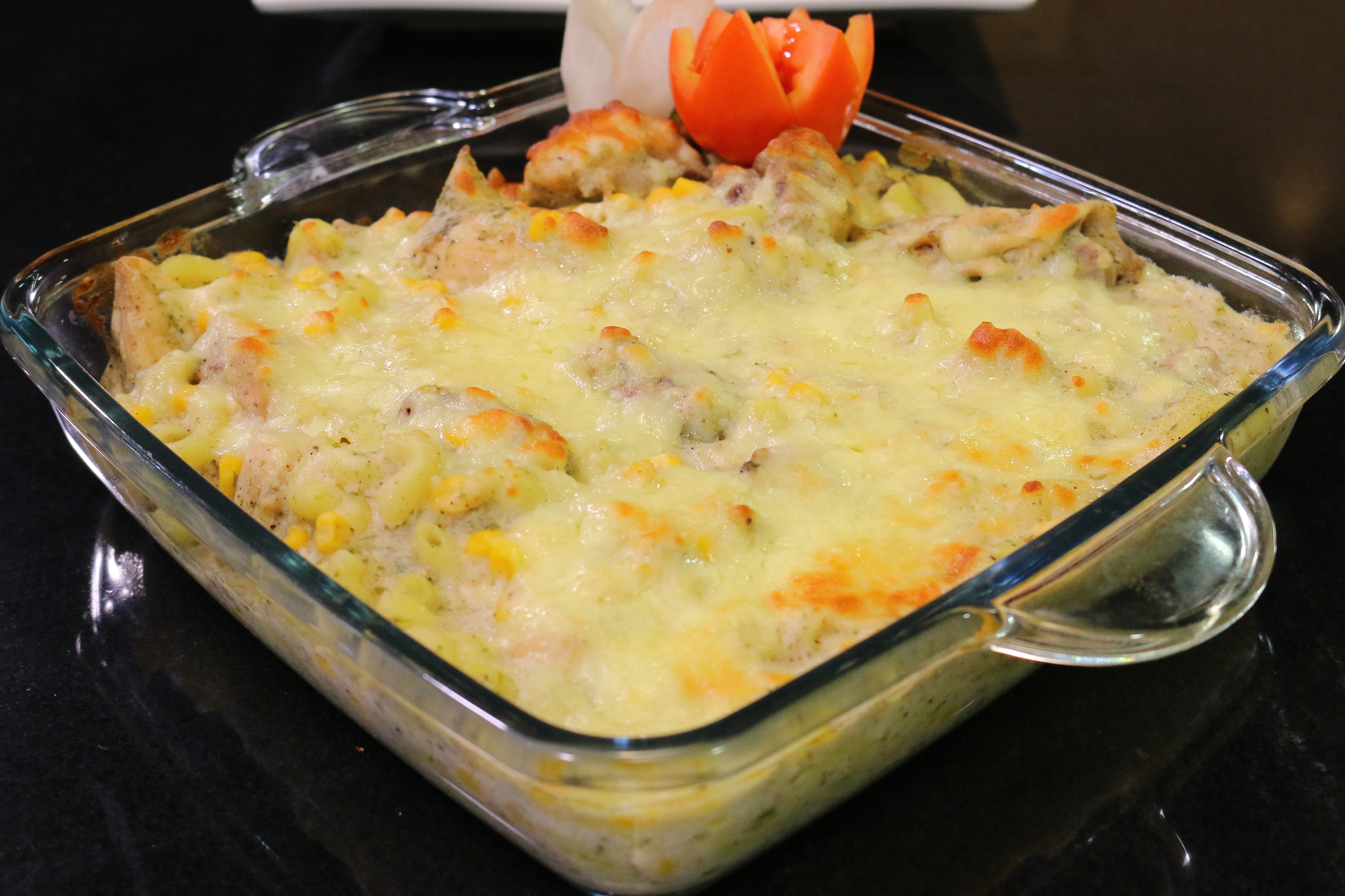 - Put this mixture in a greased oven proved dish, add boiled macaroni, cover with cheese.