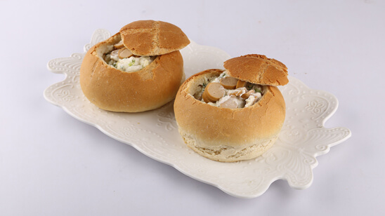 Using a serrated knife, cut the bread so that you have a large bread “core” to cut and use for dipping, but make sure the bottom of the loaf is still intact, to use as a vessel to hold the dip. Cut the core into chunks. Set the bread bowl on a platter and arrange the bread chunks around it. In a pan heat very little oil and brown the sausages. On very low heat add the cream cheese. Once the cream cheese has melted, stir in the sour cream, cheddar cheese and green chilies. Mix in half the chopped green onions. Pour the hot sausage cheese dip into the bread bowl, then sprinkle with the remaining green onions over the top. Serve warm.