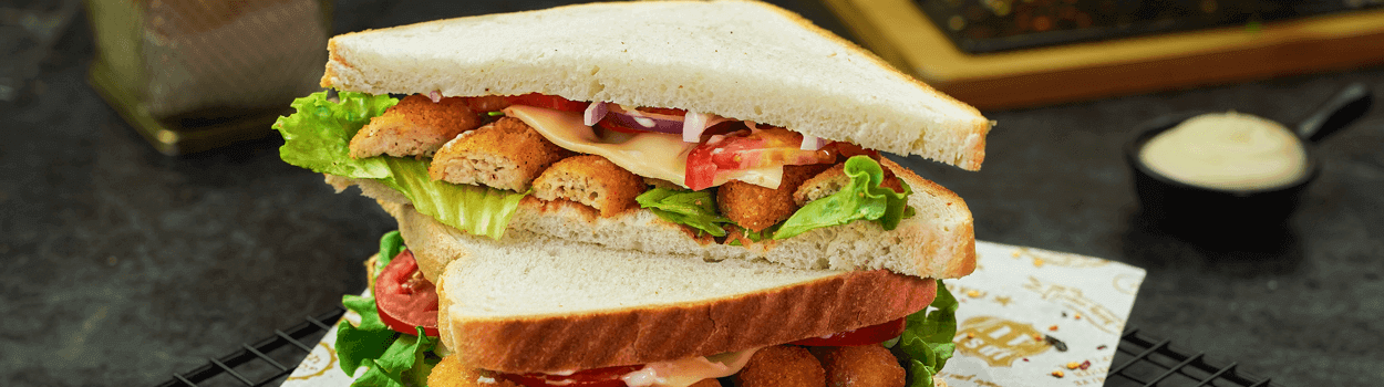Toast bread slices on both sides in a pan. Spread BBQ sauce and mayonnaise on it; lay lettuce leaves, K&N’s Croquettes, cheddar cheese slice and tomatoes. Put another bread slice on top to make a sandwich.