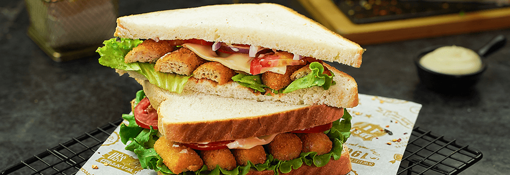 Toast bread slices on both sides in a pan. Spread BBQ sauce and mayonnaise on it; lay lettuce leaves, K&N’s Croquettes, cheddar cheese slice and tomatoes. Put another bread slice on top to make a sandwich.
