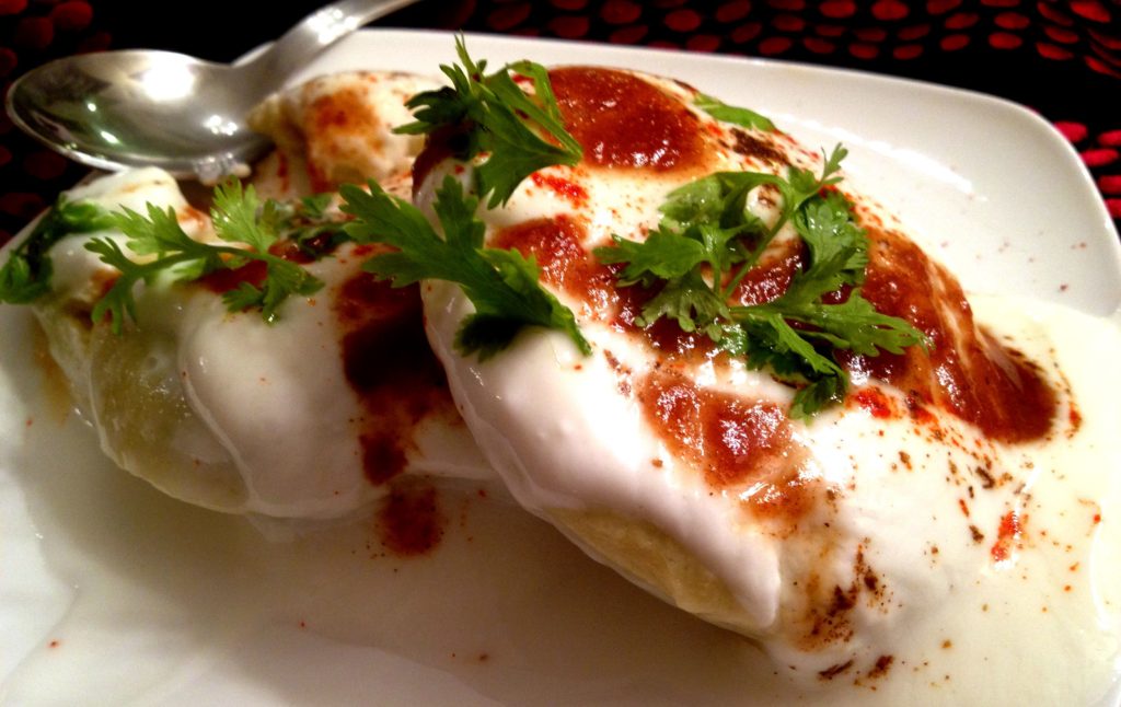 - Press dahi bara one by one with your hand and spread them in a dish with half filled yogurt mixture.