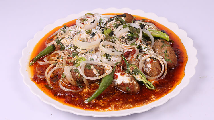 In beef mince add salt, red chili powder, onion, chopped coriander, green coriander, green chili, chopped cumin and bread slice in a chopper. For the gravy heat oil and fry onions. Roast ginger garlic paste, salt, red chili powder, turmeric, tomatoes, crushed onion. Now add the fried kababs in it. Now whipped yogurt and set a layer over it. Lastly add chopped onions, mint, green chili and the rest of the yogurt to cook at high flame and smoke it with coal to serve.