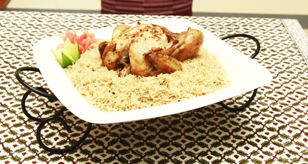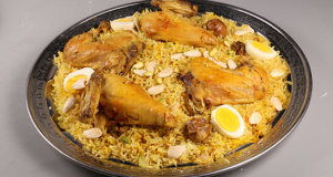 Heat butter and oil in a pan add whole spices with chopped onion and whole chicken, fry till chicken golden brown on both sides add 6 cups water with ¼ tsp grinded green cardamom, ¼ tsp saffron, 1 dried lemon, salt 1 tbsp, cover and cook till chicken tender and 2 ½ cup stock left, remove chicken from stock add ½ kg soaked rice cover and cook till rice done, slightly sprinkle powdered yellow color on one side of rice only, leave it on dum for 10 minutes. Now mix well, remove in a platter, and serve chicken over rice. In small bowl mix together 1 tbsp butter with remaining cardamom powder, saffron, soaked in hot water, lemon juice, mix well, and brush on top of chicken, bake in a preheated oven for 15 minutes.