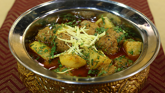 Heat oil in a pan, add whole spices, half cup water and your yogurt mixture, fry for 5 mins, make koftas with mince mixture and add it to the oil slowly, add 1 cup water with potatoes, cover and cook for 5 mins on high flame, now cook on low flame till potatoes tender, add in brown onion crushed 1 tbsp, kasuri methi ½ tsp, nutmeg and mace powder, green cardamom powder, leave it on dum for 5 mins, remove and garnish with ginger julienne, coriander leaves, serve with parathas or taftan.