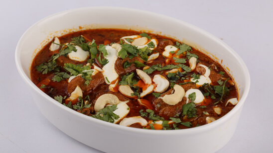 Put red chili powder, cumin powder, coriander powder, salt and ginger garlic paste on chicken and leave for 2-3 hours. Now fry it in tbsp oil and butter. In separate pan add rest of the butter and oil and fry onion in it. Also add cardamom and cinnamon then fry. Add tomato paste, sugar and green chili and saute gravy. Add remaining salt and pepper then add chicken. Saute it well then add ½ cup water and let chicken get tender. Now add cream and dried fenugreek leaves and leave it on dum. Take out in dish and garnish with cashew nut.