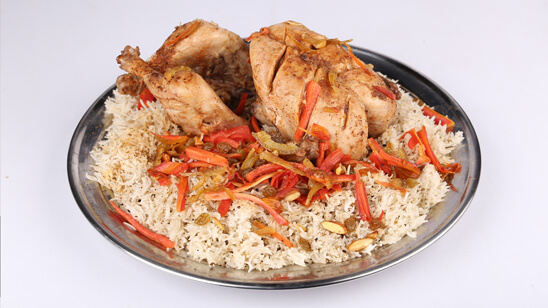 In a pot add whole chicken, salt and red chili powder. Boil it well. Then heat clarified butter and fry onion well. Now add ginger garlic paste, whole chicken and salt. Cook well. Once it gets boiled, add soaked rice and crushed black pepper. Mix well. Then add carrots, raisins, almonds, oil and sugar. Cook well for about 2 minutes. Now add this mixture into the rice. Lastly add all spice powder and dish out. Serve hot.