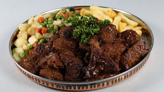 Marinate bite size pieces of undercut with all the given ingredients and pan fry in batches, when one side brown, turn and fry the other side, add butter, mix well, remove steak bite pieces, in the same pan add some more butter and fry the remaining marination liquid till done, pour this garlicy marination on the steak bites, serve garnished with fries and mixed vegetables.