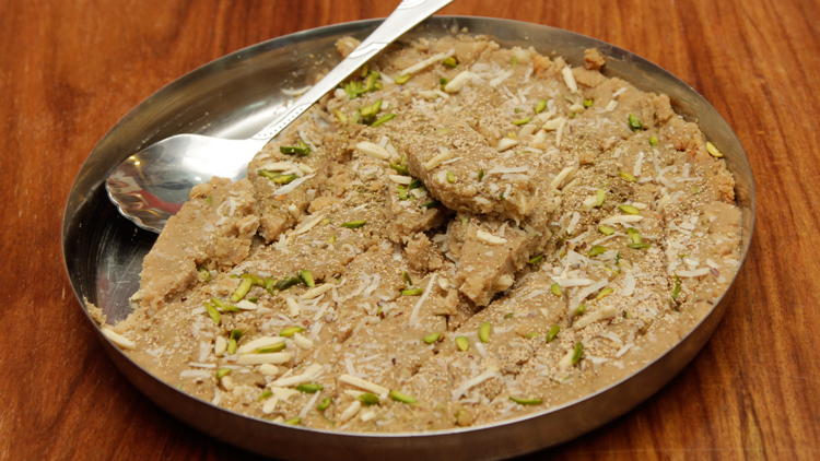 - Spread evenly in a greased thali, cut in pieces.