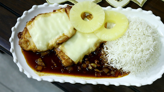 Fry them in oil . Reduce the oil add onion 1 medium. Soya sauce 1 tbsp , chilly sauce 1 tbsp, garlic crushed , salt , red chili crushed, chicken stock 1 cup. Bring to boil add cornflour. In a platter put chicken breast pieces , prepared sauce , grilled pineapple slices whole . Serve with rice. Garnish with spring onion
