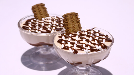 Phir is mixture ki half quantity whipped cream men dal ker mix ker len or gelatin mila ker serving glasses men dal ker phir 10 minutes kay liye fridge men rakh den jab mousse set ho jae to phir hazelnut kay mixter glassed kay top per dalen or phir cookies laga ker serve karen.
