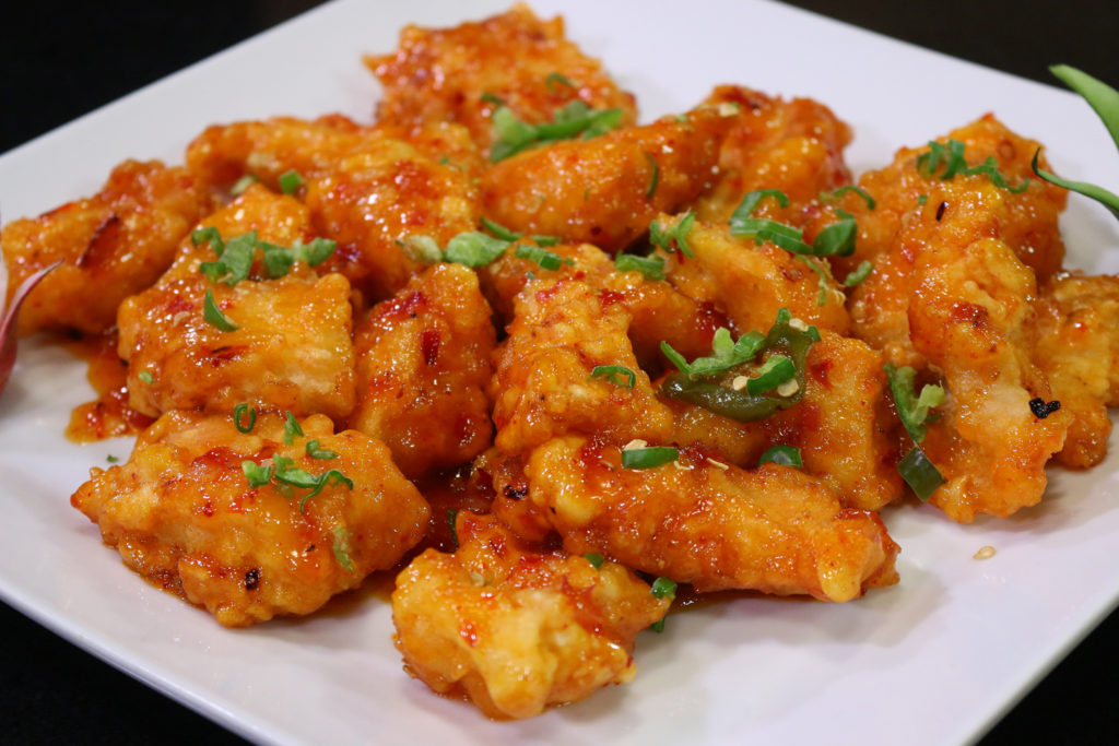- Marinate fish with salt, chili powder, chili oil, corn flour, mix well and deep fry for 5 mins, remove, heat ¼ cup oil in a wok, add 2 tbsp chili oil, crushed garlic, when light golden add chopped onion, chopped green chili, sweet chili sauce, salt, chicken powder, crushed pepper, chili garlic sauce.