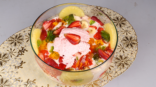 In the milk add vermicelli and cook well. Then in the water add sugar, water and vanilla custard powder. Dissolve it well and add to the milk and vermicelli mixture. Allow it to cool. Now cook all the three jellies and allow it to cool. Then in a bowl add cream, condensed milk and vanilla essence. Beat well. Now cut bananas, pineapple and strawberries. Place it in a big serving bowl. Then add ice cream, custard and cream mixture. Mix well. Lastly add jellies and serve chilled.