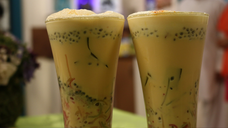 - Now put ice in two glasses then put falooda vermicelli and basil seeds