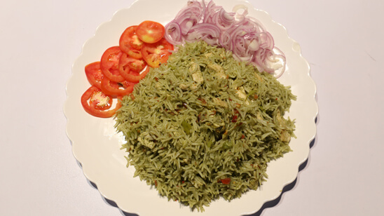 Heat oil in wok add onion sauté well. Add ginger garlic paste cook well. Add green chilies and tomato cook well. Add chicken fry well. Add salt, crushed red chili, chicken powder and white pepper with boiled spinach cook till oil separate. Add boiled rice mix well and cook for 1 to 2 minute.