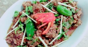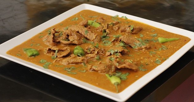 Take a cooking pan add 4-5 tbsp of oil add 1 tsp of whole black pepprt corns, 1 tsp of cumin seeds, 3-4 green cardamoms, 4-5 cloves, 2-3 bay leaves, mix it well when its popping then add 2 finely chopped onion add 1 tbsp of ginger garlic paste and fry when its brown then add ½ kg of pasanday and roasted add 1 tbsp of crushed red chili, mix it well roasted. When its cook and tender add ½ bunch of coriander, 5-6 green chilies, steam it when it’s done take it out in a serving dish and serve it.
