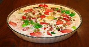 - Then add the drained fruit cocktail, crushed nuts and boiled vermicelli. garnish with jelly.