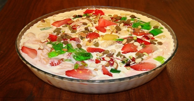 Then add few noodles. Now make another layer. In the end garnish with cream, walnuts, almonds, jelly and few pineapples, noodles. Cool it and serve.