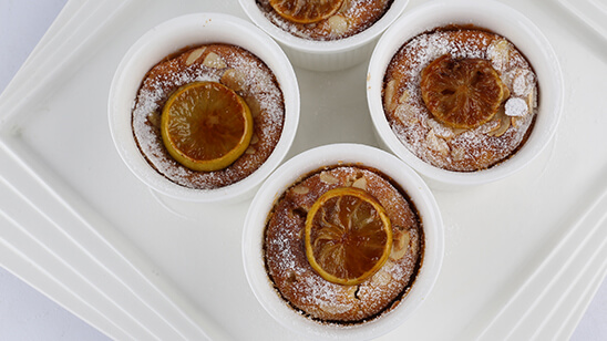 Beat 50gm butter, add in caster sugar and egg yolks, 1 at a time, add lemon rind, lemon juice, flour, baking powder, ground almonds and milk. Beat egg whites until soft peaks form. Gently fold egg whites through lemon mixture (mixture may look a little curdled). Spoon mixture into a greased pudding dish. Sprinkle with flaked almonds. Bake at 180 degrees c for 40-45 minutes or until golden and just set (cover with foil during cooking if over-browning).place brown sugar in a shallow dish. Dip lemon slices in sugar to coat. Melt remaining butter in a frying pan. Cook lemon slices for 1 minute each side or until sugar caramelizes. Top pudding with lemon slices. Dust with icing sugar. Serve immediately with ice-cream.