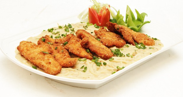 Marinate chicken strips with salt, pepper, chili powder, mustard, egg and flour, then roll each strip in bread crumbs, deep fry till light golden, keep aside, heat butter and oil add garlic paste, add 1 cup white sauce with cream, salt, black pepper crushed, vinegar and soya sauce, water. Fold in boiled pasta and spring onion leaves, remove in a platter, top with fried chicken strips and chopped parsley.